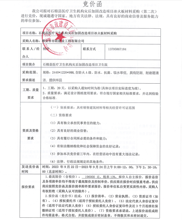 石棉縣醫(yī)療衛(wèi)生機構災后加固改造項目冰火板材料采購(第二次)競價公告