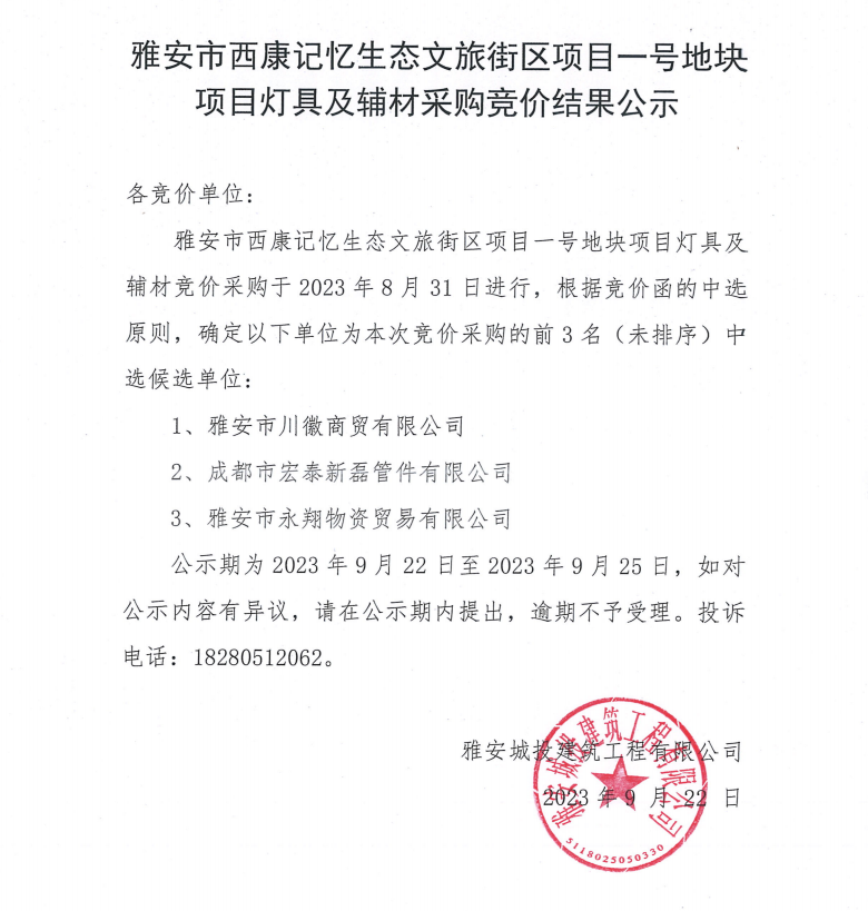 雅安市西康記憶生態(tài)文旅街區(qū)項(xiàng)目一號地塊項(xiàng)目燈具及輔材采購競價(jià)結(jié)果公示