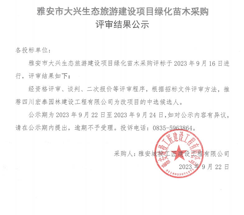 雅安市大興生態(tài)旅游建設(shè)項(xiàng)目綠化苗木采購評(píng)審結(jié)果公示