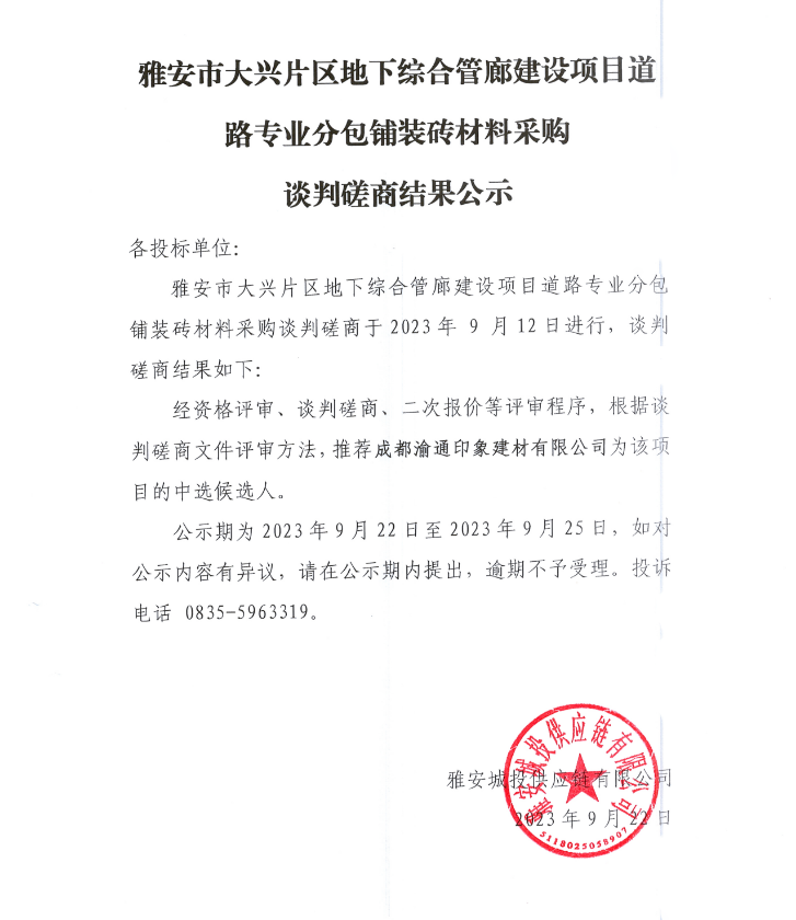 雅安市大興片區(qū)地下綜合管廊建設(shè)項(xiàng)目道路專業(yè)分包鋪裝磚材料采購談判磋商結(jié)果公示