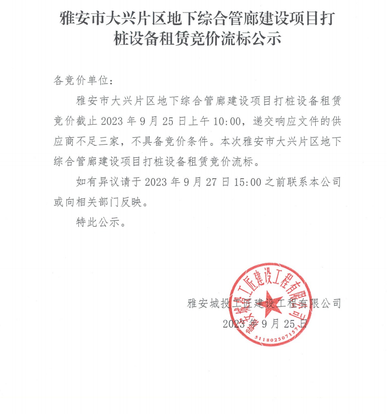 雅安市大興片區(qū)地下綜合管廊建設(shè)項(xiàng)目打樁設(shè)備租賃競(jìng)價(jià)流標(biāo)公示