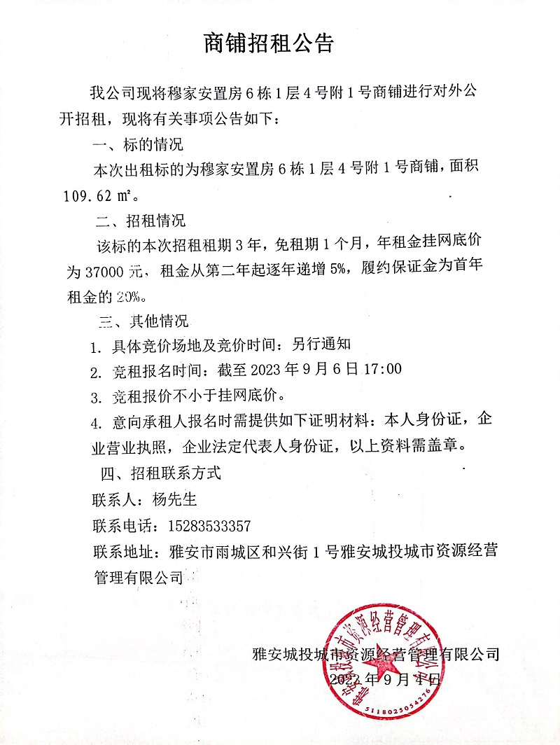 穆家安置房6棟1層4號附1號商鋪招租公告