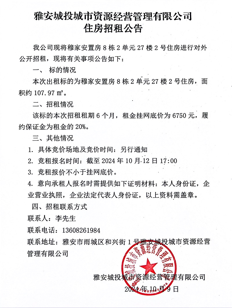 雅安城投城市資源經(jīng)營管理有限公司關(guān)于穆家安置房8棟2單元27樓2號(hào)住房招租公告