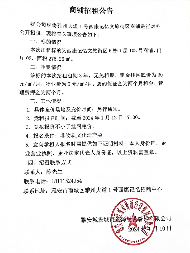 雅州大道1號(hào)西康記憶文旅街區(qū)5棟1層103號(hào)商鋪、門(mén)廳02招租公告