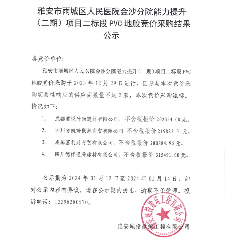 雅安市雨城區(qū)人民醫(yī)院金沙分院能力提升(二期)項目二標(biāo)段PVC地膠競價采購結(jié)果公示