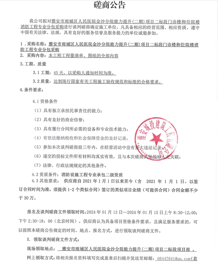 雅安雨城區(qū)人民醫(yī)院金沙分院能力提升(二期)項目二標(biāo)段門診樓和住院樓消防工程專業(yè)分包采購談判磋商公告