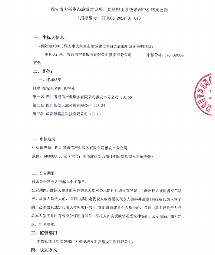 雅安市大興生態(tài)旅游建設項目光彩照明系統(tǒng)采購中標結果公告