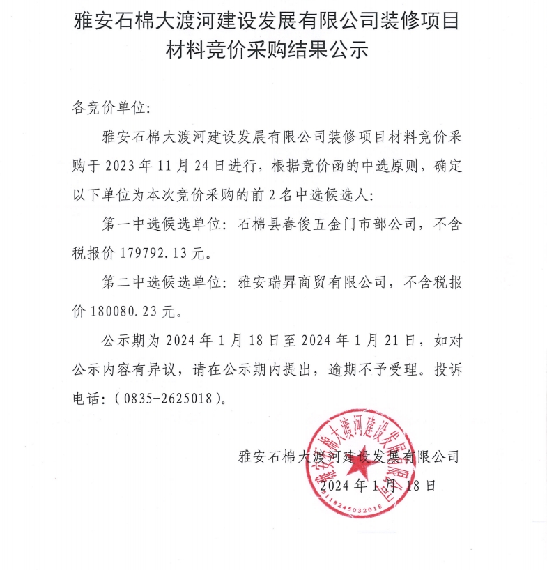 雅安石棉大渡河建設(shè)發(fā)展有限公司裝修材料競(jìng)價(jià)采購(gòu)結(jié)果公示