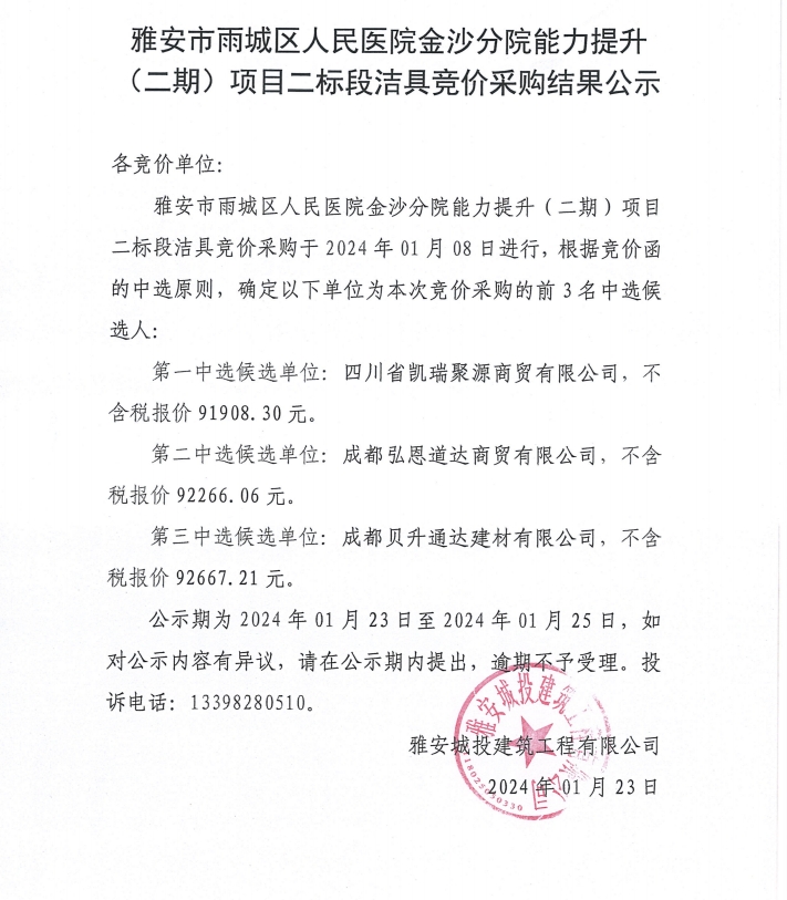 雅安市雨城區(qū)人民醫(yī)院金沙分院能力提升(二期)項(xiàng)目二標(biāo)段潔具競(jìng)價(jià)采購(gòu)結(jié)果公示