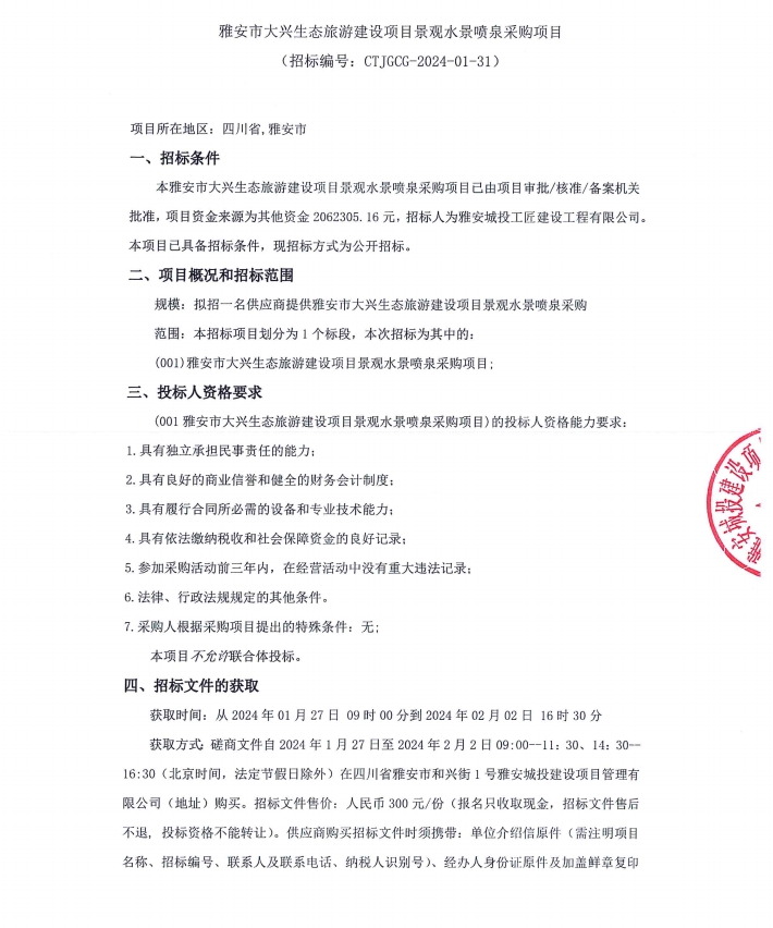 雅安市大興生態(tài)旅游建設(shè)項(xiàng)目景觀水景噴泉采購項(xiàng)目公告