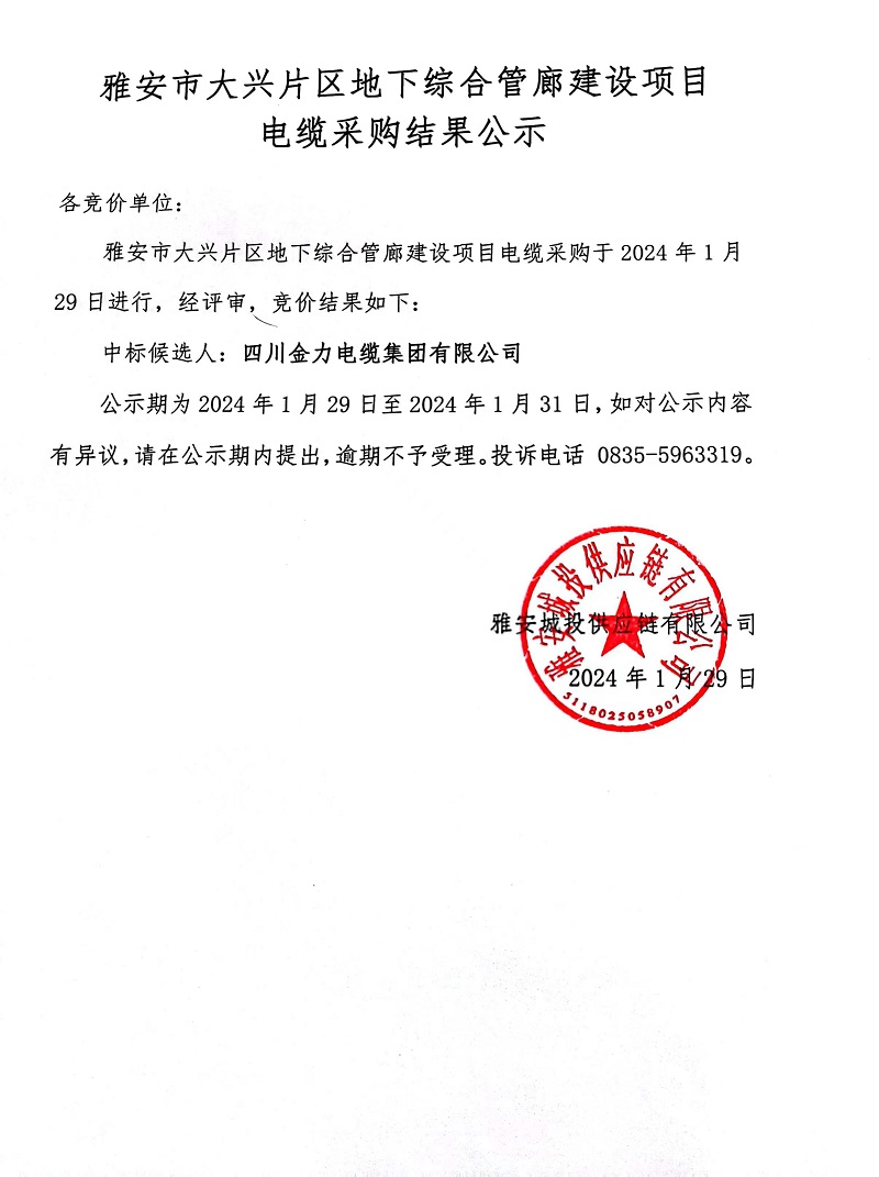 雅安市大興片區(qū)地下綜合管廊建設項目電纜采購結果公示