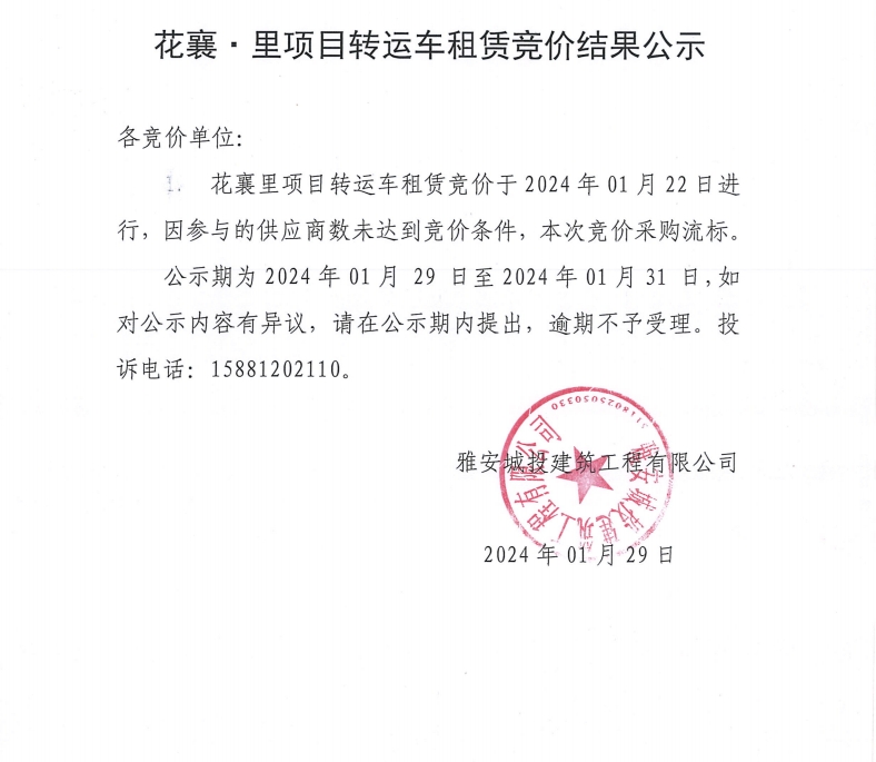 花襄·里項(xiàng)目轉(zhuǎn)運(yùn)車(chē)租賃競(jìng)價(jià)結(jié)果公示