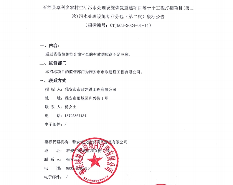 石棉縣草科鄉(xiāng)農(nóng)村生活污水處理設(shè)施恢復(fù)重建項(xiàng)目等十個工程打捆項(xiàng)目(第二次)污水處理設(shè)施專業(yè)分包(第二次)廢標(biāo)公告
