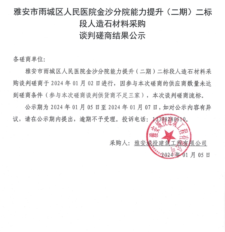 雅安市雨城區(qū)人民醫(yī)院金沙分院能力提升(二期)二標(biāo)段人造石材材料采購(gòu)談判磋商結(jié)果公示