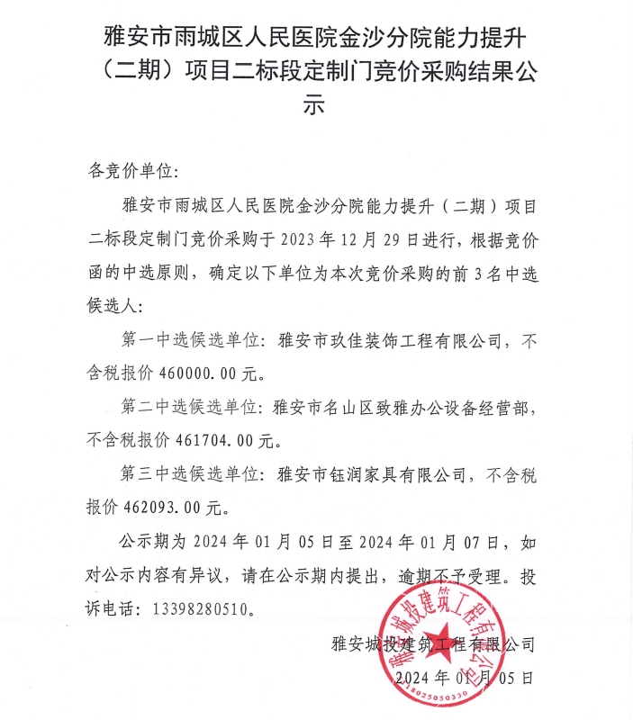 雅安市雨城區(qū)人民醫(yī)院金沙分院能力提升(二期)項(xiàng)目二標(biāo)段定制門競價采購結(jié)果公示