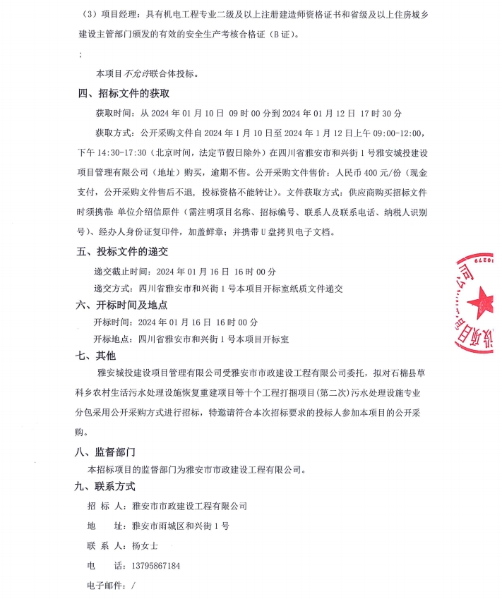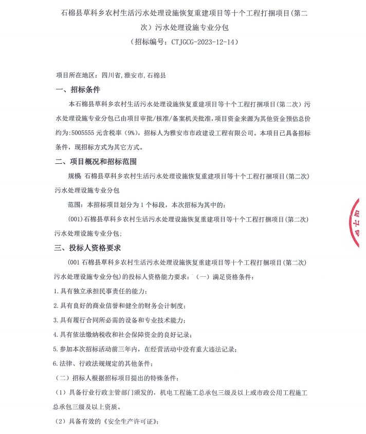 石棉縣草科鄉(xiāng)農村生活污水處理設施恢復重建項目等十個工程打捆項目(第二次)污水處理設施專業(yè)分包采購公告