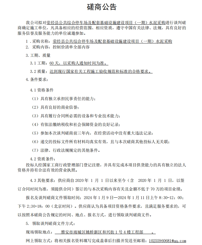 滎經(jīng)縣公共綜合停車場(chǎng)及配套基礎(chǔ)設(shè)施建設(shè)項(xiàng)目(一期)水泥材料采購(gòu)談判磋商公告