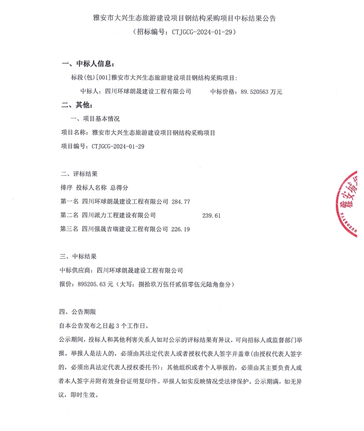雅安市大興生態(tài)旅游建設(shè)項(xiàng)目結(jié)構(gòu)采購項(xiàng)目中標(biāo)結(jié)果公告