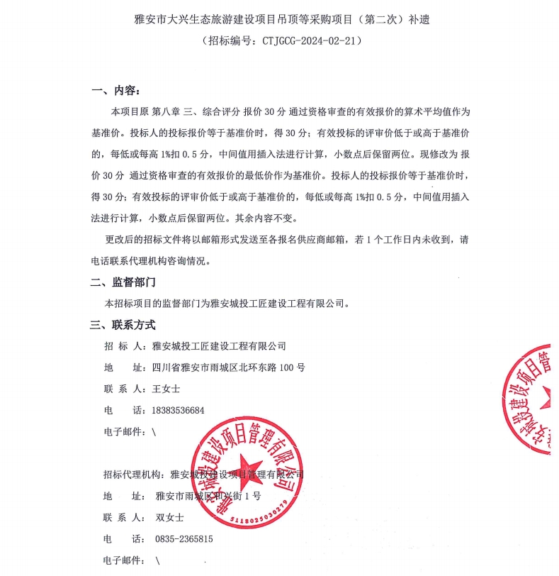 雅安市大興生態(tài)旅游建設(shè)項(xiàng)目吊頂?shù)炔少?gòu)項(xiàng)目(第二次)補(bǔ)遺公告