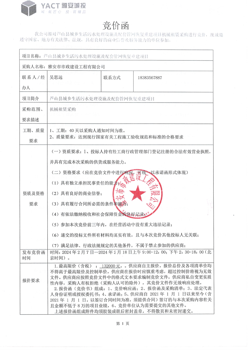 蘆山縣城鄉(xiāng)垃圾處理設(shè)施及配套管網(wǎng)恢復(fù)重建項(xiàng)目機(jī)械租賃采購(gòu)競(jìng)價(jià)函