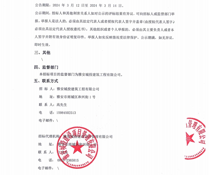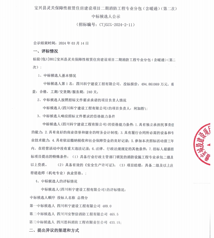 寶興縣靈關(guān)保障性租賃住房建設(shè)項(xiàng)目二期消防工程專(zhuān)業(yè)分包(含暖通)(第二次)中標(biāo)候選人公示
