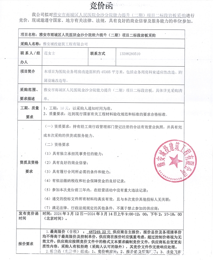 雅安市雨城區(qū)人民醫(yī)院金沙分院能力提升(二期)項(xiàng)目二標(biāo)段巖板采購競價(jià)公告