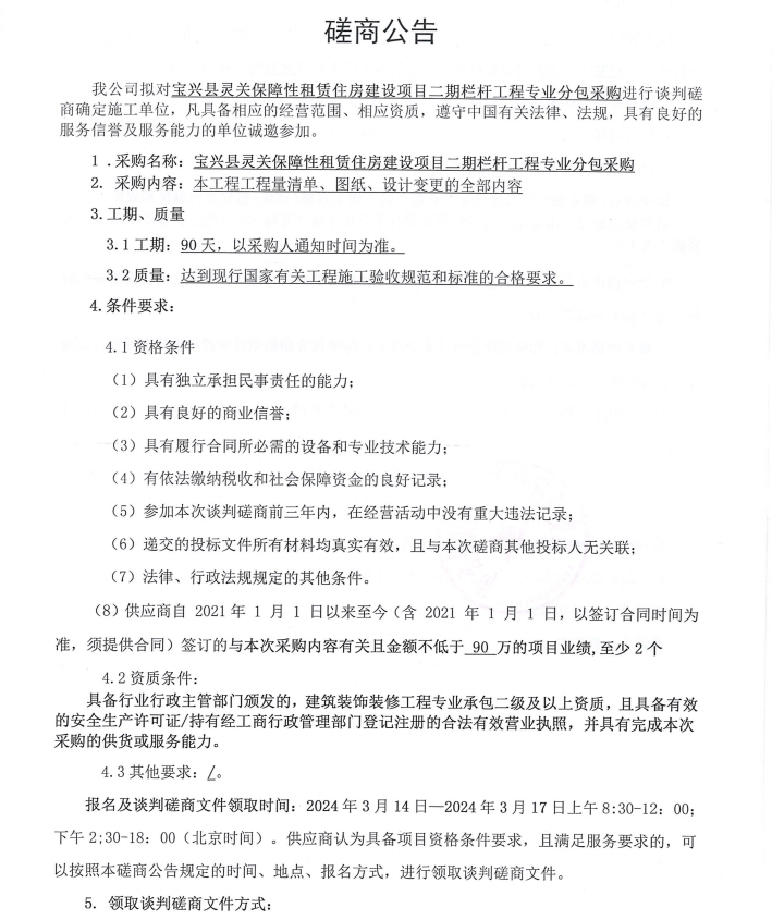 寶興縣靈關(guān)保障性租賃住房建設(shè)項(xiàng)目二期欄桿工程專業(yè)分包采購磋商公告