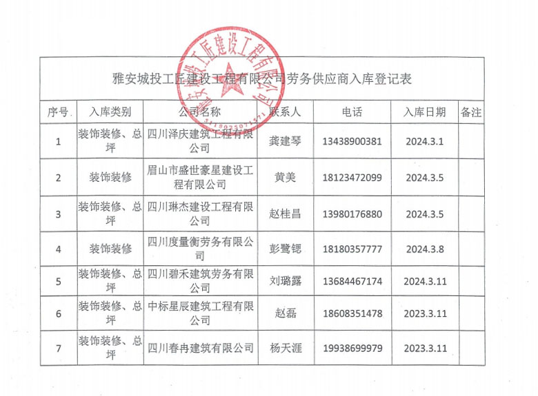 雅安城投工匠建設(shè)有限公司勞務(wù)供應(yīng)商入庫(kù)登記公示