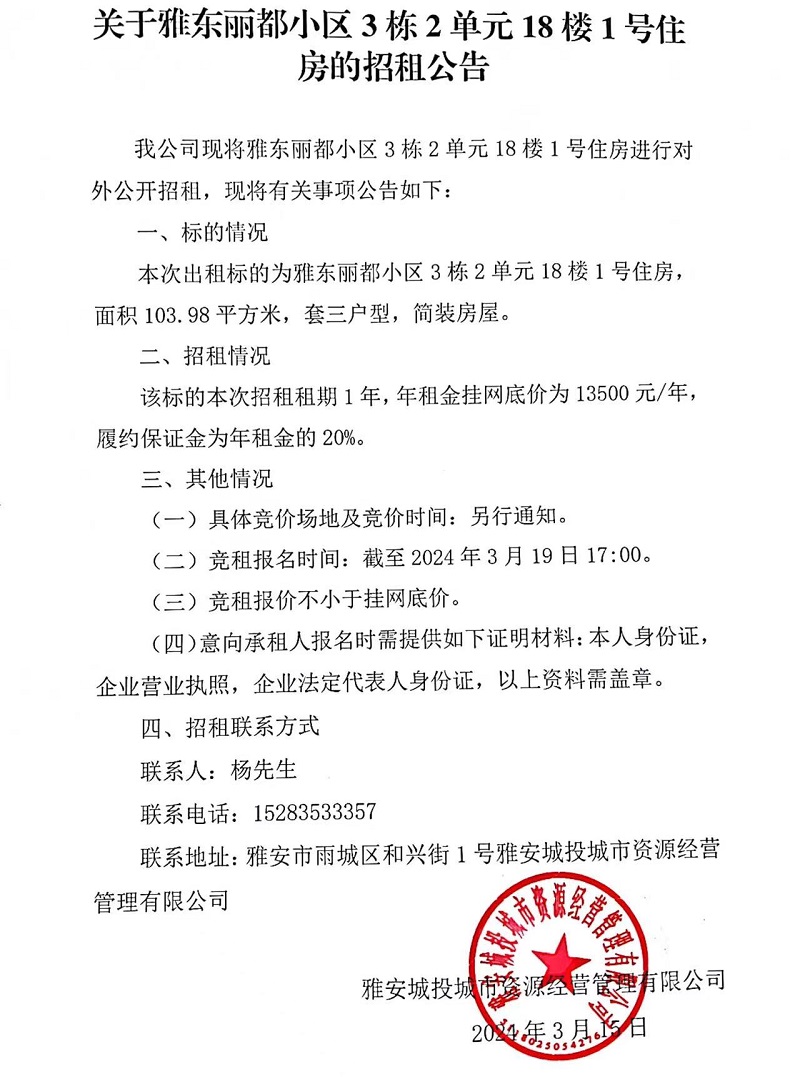 關于雅東麗都小區(qū)3棟2單元18樓1號住房的招租公告
