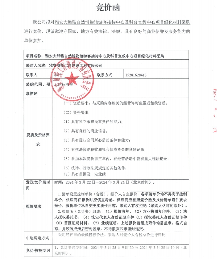 雅安大熊貓自然博物館游客接待中心及科普宣教中心項(xiàng)目綠化材料采購競價(jià)公告