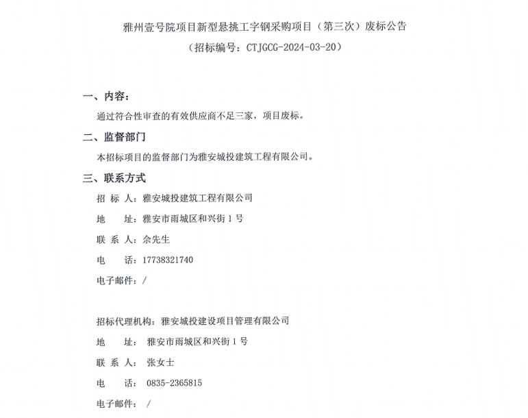 雅州壹號院項目新型懸挑工字鋼采購項目(第三次)廢標(biāo)公告