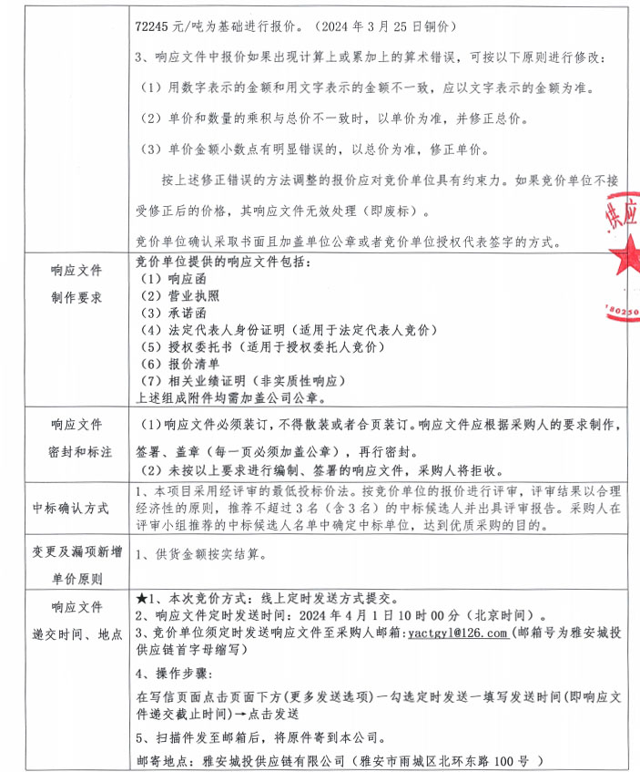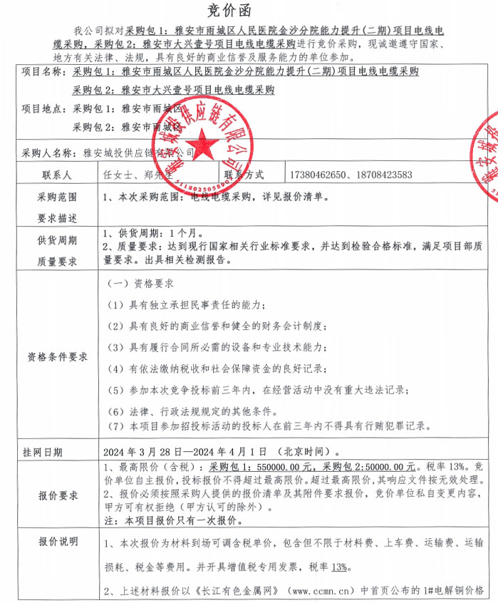 雅安城投供應(yīng)鏈有限公司電線電纜采購競價(jià)公告