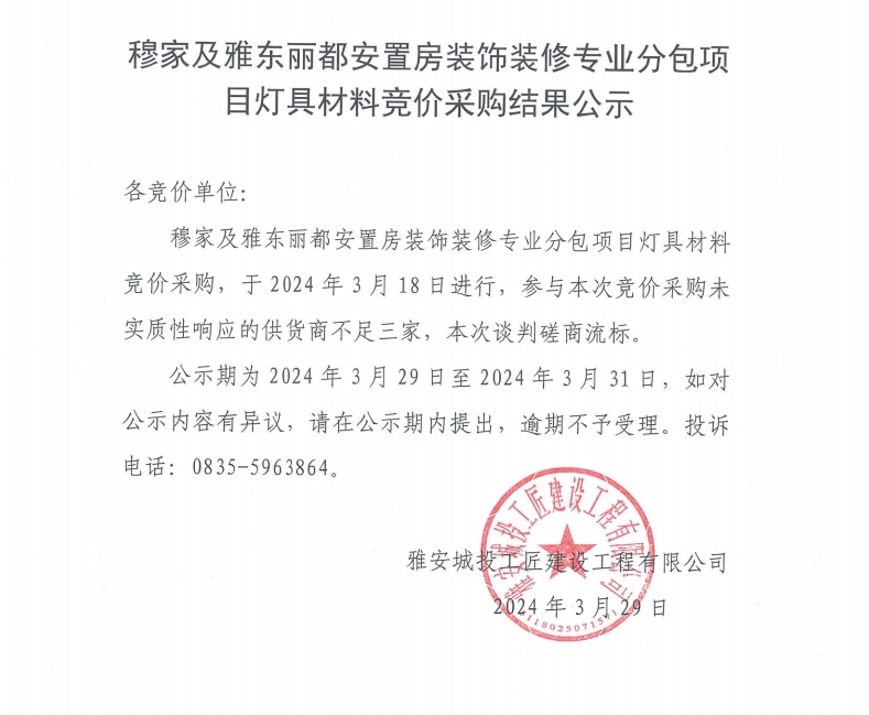 穆家及雅東麗都安置房裝飾裝修專業(yè)分包項(xiàng)目燈具材料采購(gòu)競(jìng)價(jià)結(jié)果公示