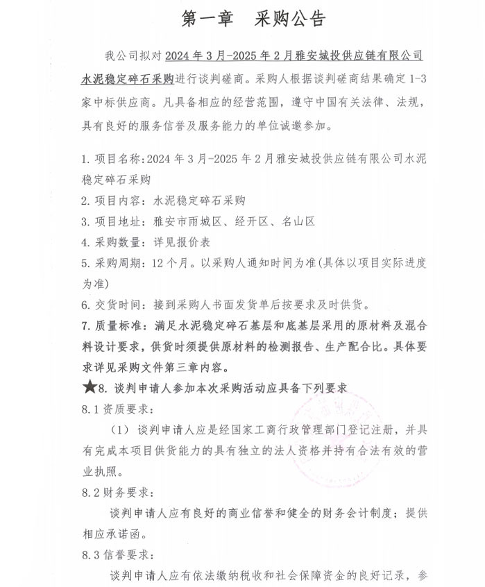 2024年3月-2025年2月雅安城投供應(yīng)鏈有限公司水泥穩(wěn)定碎石采購(gòu)公告