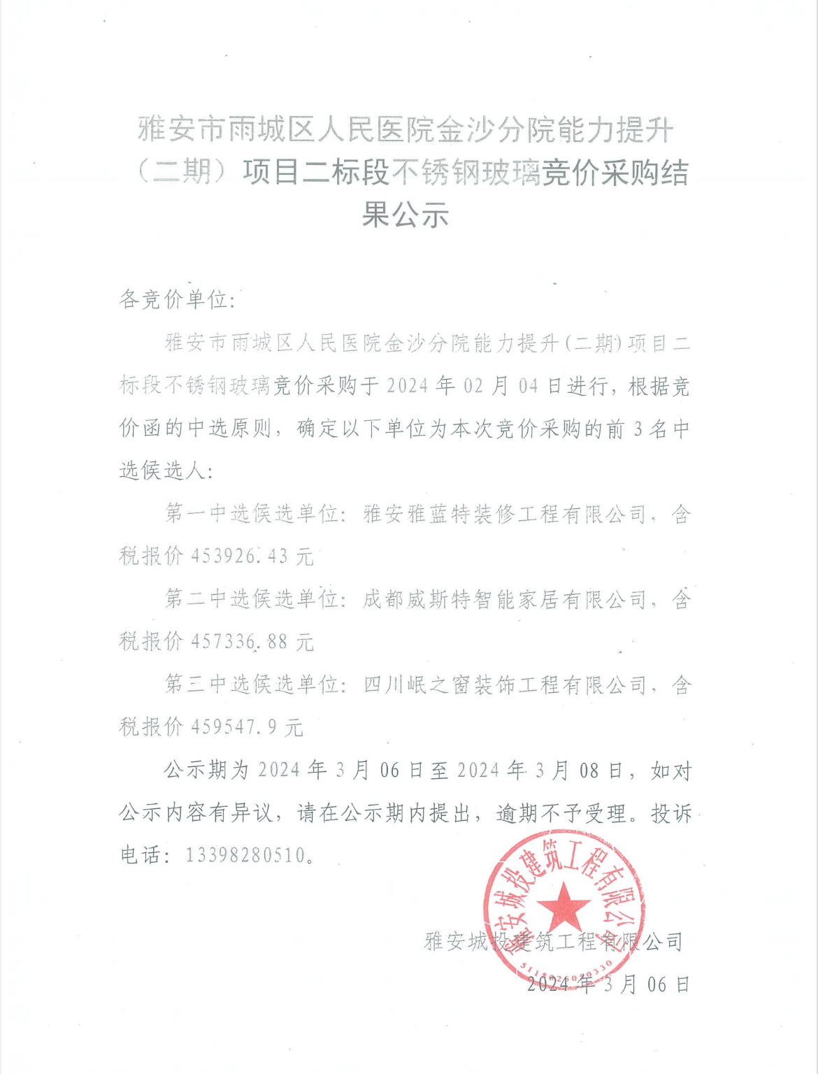 雅安市雨城區(qū)人民醫(yī)院金沙分院能力提升(二期)項(xiàng)目二標(biāo)段不銹鋼玻璃競價(jià)采購結(jié)果公示