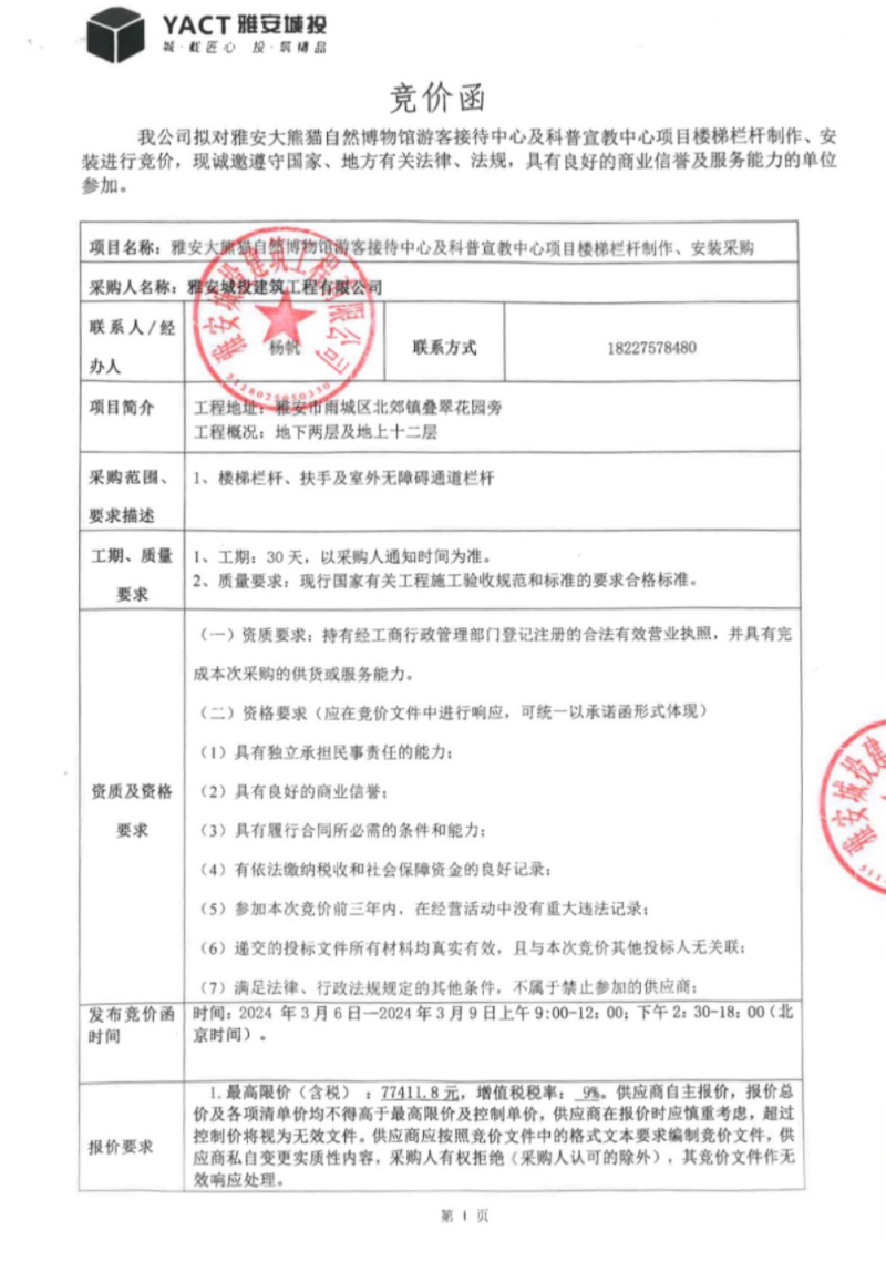 雅安大熊貓自然博物館游客接待中心及科普宣教中心項(xiàng)目樓梯欄桿制作、安裝采購競價(jià)公告