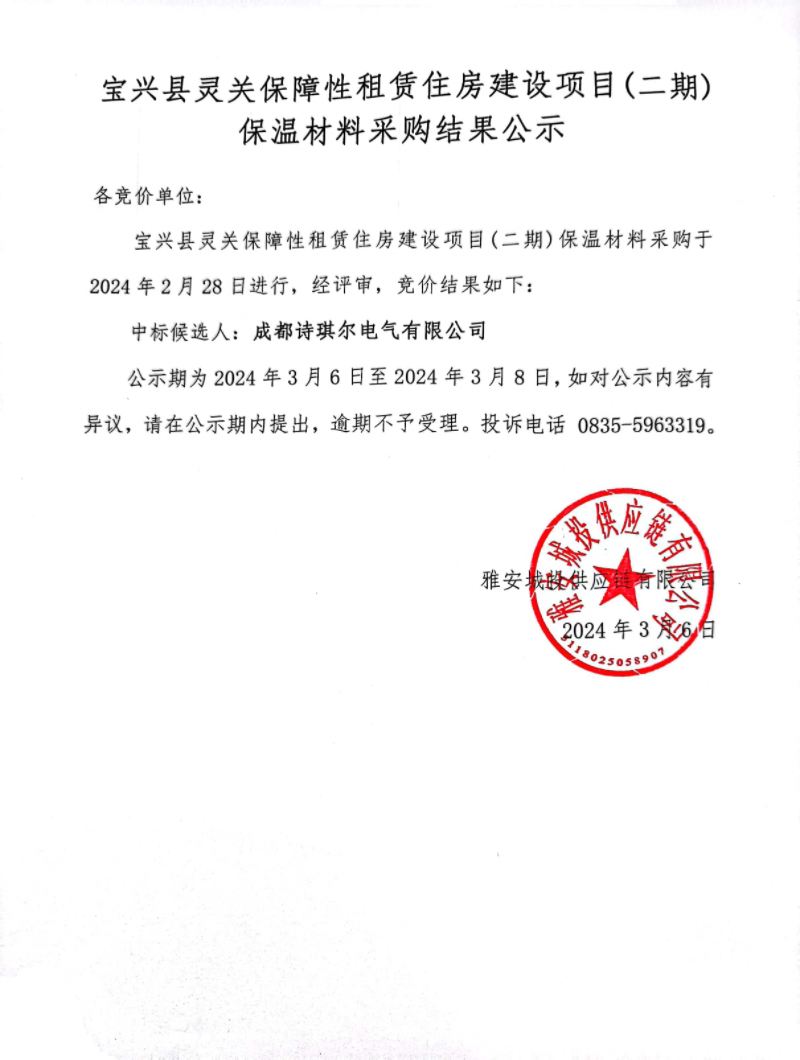 寶興縣靈關(guān)保障性租賃建設(shè)項(xiàng)目(二期)保溫材料采購結(jié)果公示