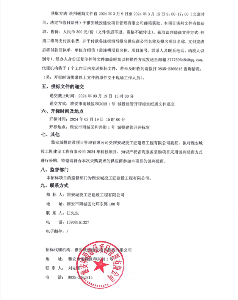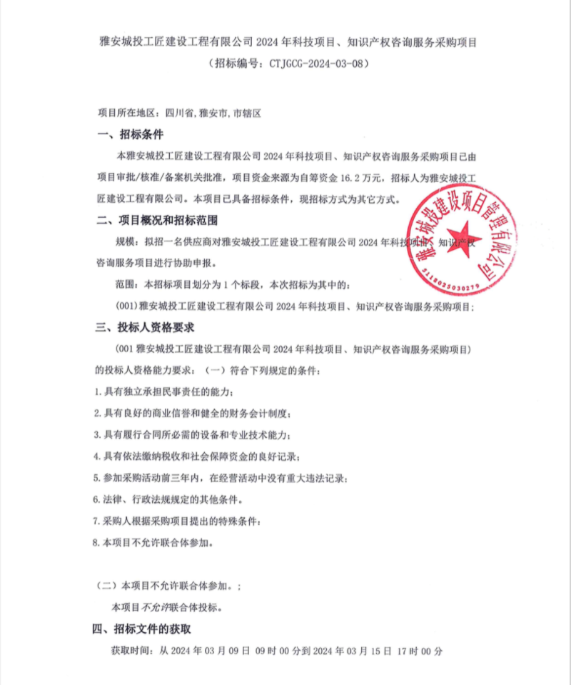 雅安城投工匠建設(shè)工程有限公司2024年科技項目、知識產(chǎn)權(quán)咨詢服務采購項目