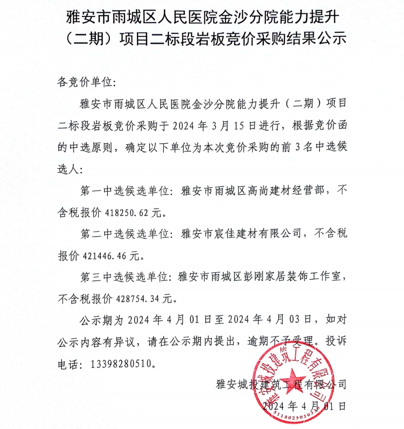 雅安市雨城區(qū)人民醫(yī)院金沙分院能力提升(二期)項目二標段巖板競價采購結果公示