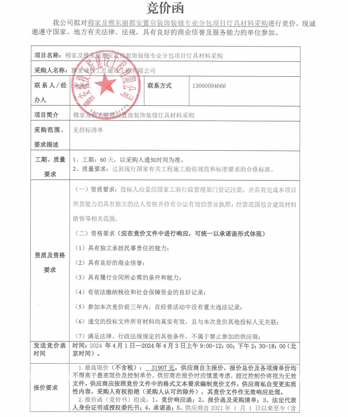 穆家及雅東麗都安置房裝飾裝修專業(yè)分包項(xiàng)目燈具材料采購(gòu)競(jìng)價(jià)公告