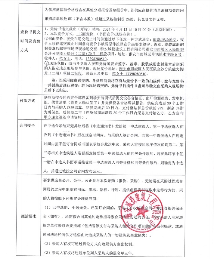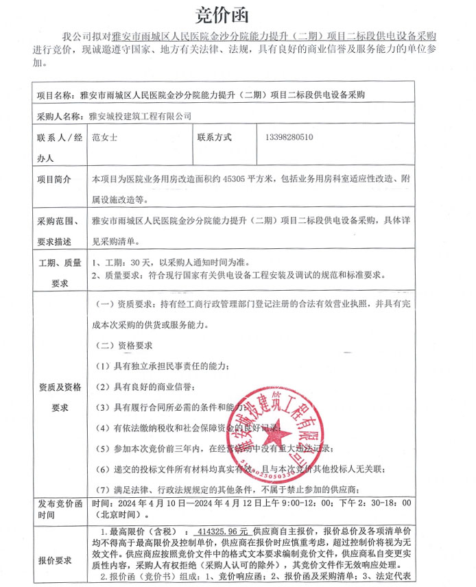 雅安市雨城區(qū)人民醫(yī)院金沙分院能力提升(二期)項目二標(biāo)段供電設(shè)備采購競價公告