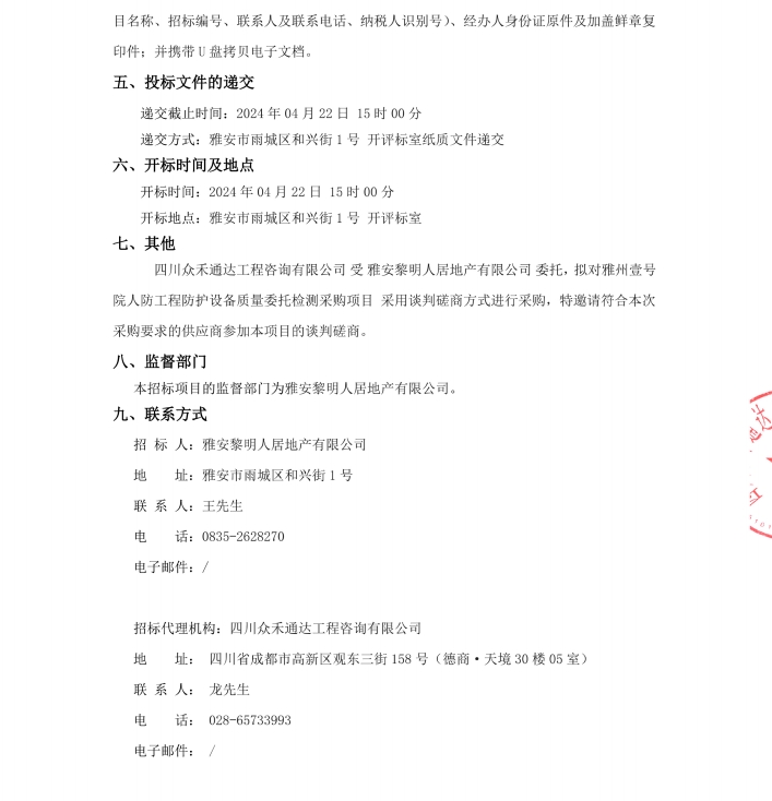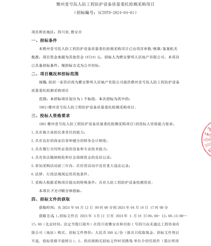 雅州壹號院人防工程防護設備質量委托檢測采購項目公告