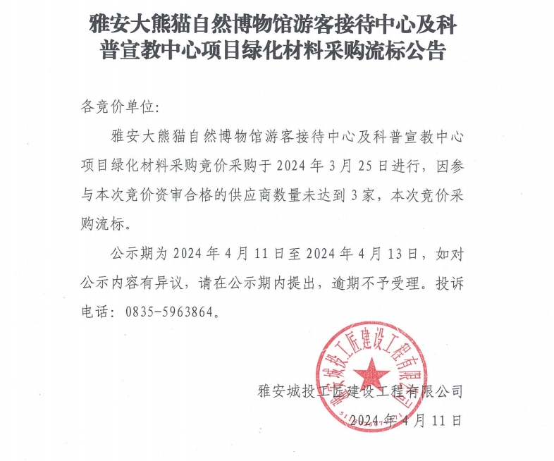 雅安大熊貓自然博物館游客接待中心及科普宣教中心項(xiàng)目綠化材料采購(gòu)流標(biāo)公告