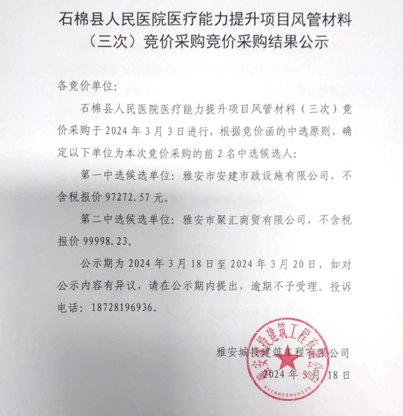石棉縣人民醫(yī)院醫(yī)療能力提升項目風管材料(三次)競價采購競價采購結果公示