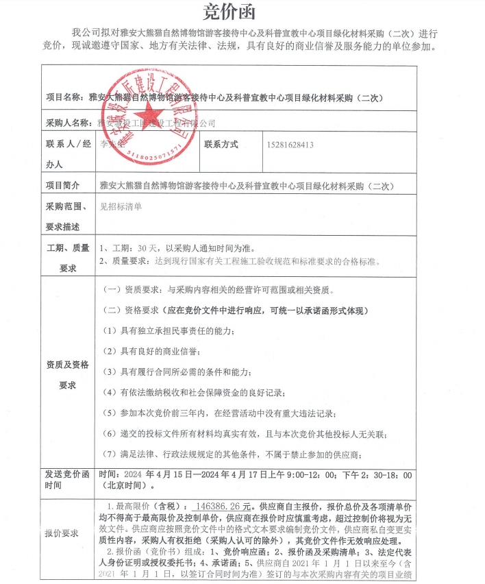 雅安大熊貓自然博物館游客接待中心及科普宣教中心項(xiàng)目綠化材料采購(二次)競(jìng)價(jià)公告