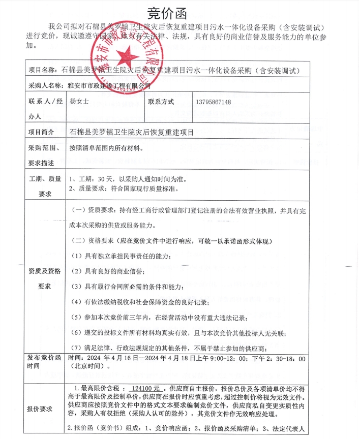石棉縣美羅鎮(zhèn)衛(wèi)生院災(zāi)后恢復(fù)重建項(xiàng)目污水一體化設(shè)備材料采購(gòu)(含安裝調(diào)試)競(jìng)價(jià)公告
