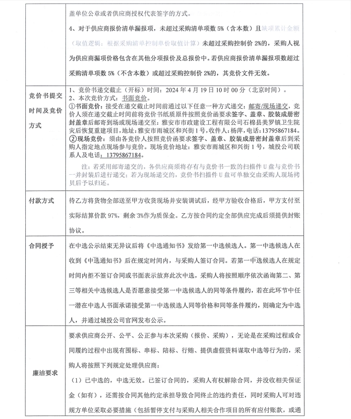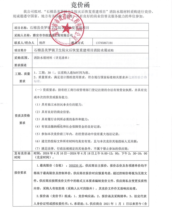 石棉縣美羅鎮(zhèn)衛(wèi)生院災后恢復重建項目消防水箱材料采購競價公告