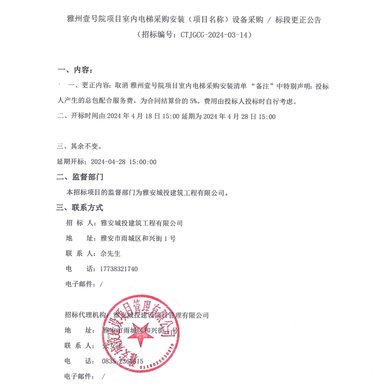 雅州壹號(hào)院項(xiàng)目室內(nèi)電梯采購安裝(項(xiàng)目名稱)設(shè)備采購/標(biāo)段更正公告