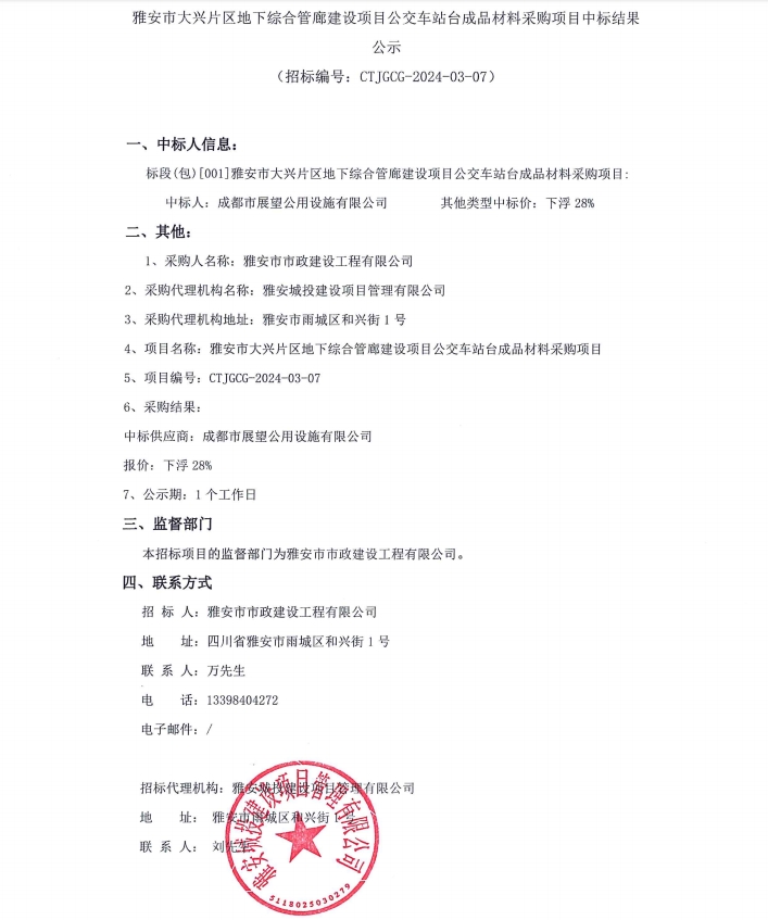 雅安市大興片區(qū)地下綜合管廊建設(shè)項目公交車站臺成品材料采購項目中標結(jié)果公示