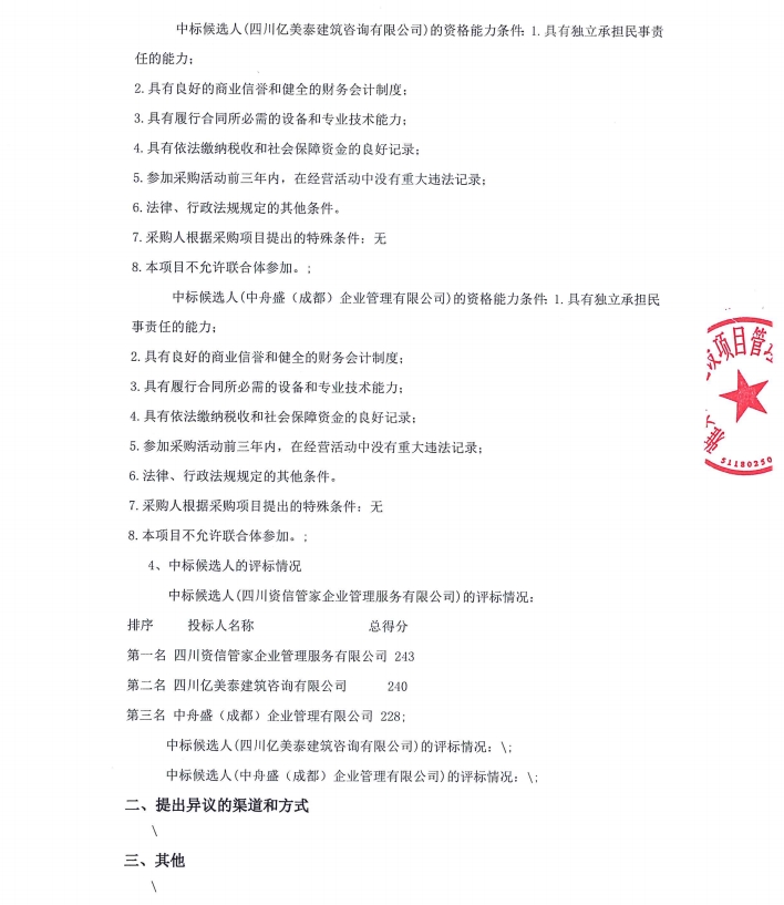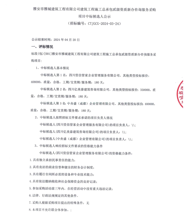 雅安市雅城建筑工程有限公司建筑工程施工總承包貳級(jí)資質(zhì)新辦咨詢服務(wù)采購項(xiàng)目中標(biāo)候選人公示